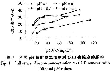 2.1反應條件對COD去除率的影響在不同的pH值條件下.改變通人廢水中的臭氧量,廢水COD去除率的變化規律見圖1。