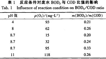 2.2反應條件對廢水BOD與COD比值的影響表1是在不同的pH值,及不同的臭氧濃度下廢水BOD與COD比值的變化情況。