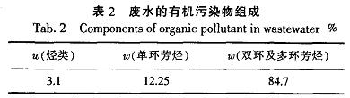 2.3臭氧氧化法處理前后廢水的UV254比較表2是廢水中的有機物組成。從表2可以看出,廢水中的有機污染物主要是難降解的芳烴,尤其是大分子的雙環和多環芳烴的所占的比例較大.這正是該類廢水的可生化性較差的原因。