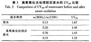 芳烴類物質的紫外光譜在波長254nm處有很強的吸收峰,因此,UV的大小也可以反應出廢水中難生化降解的芳烴類物質的多少。表3比較了廢水和幾種臭氧氧化法處理前后水的UV大小。從表3可以看出,經過氧化處理后廢水的UV瑚都有所降低說明廢水經過臭氧氧化處理后。其中難生化降解的芳烴類物質減少了.可生化性得到改善;從表3還可以看出,經臭氧處理后的廢水UV254的數值越小,廢水的BOD與COD的質量比越大。說明經過臭氧氧化后廢水中的大分子難降解的芳烴類物質越少,廢水的可生化性越好。