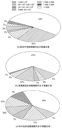 臭氧氧化和BAF降解對廢水中有機物的相對分子質量的變化有顯著影響. 如圖 5所示,原水中的有機物主要集中在相對分子質量小于1000和大于100×103,其分別占總量的52%、 26%,經臭氧氧化后,廢水中的有機物相對分子質量分布得到明顯的改變,小于1000的有機物提高為67%,而大于100×103的有機物降為8%. 因此臭氧氧化可使大分子有機物轉化為小分子有機物,使大分子有機物比例明顯降低,小分子有機物比例顯著增加. 由于小分子有機物更容易被微生物代謝所利用,因此臭氧氧化強化了后續BAF單元對該部分有機物的去除,這從BAF單元出水中的有機物相對分子質量分布情況可以看出,經BAF單元的微生物降解后,相對分子質量小于1000的有機物的比例從67%降低至40%. 由于BAF單元出水中含有微生物次生代謝產物等物質,而該部分物質較短的停留時間內不容易被降解,所以相對分子質量小于1000有機物所占比例仍有40%. 大分子有機物則很難被濾池內微生物降解,所以所占比例沒有發生明顯變化.
